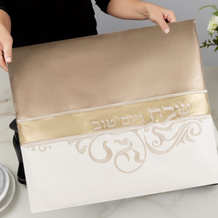 כיסוי פלטה מהודר דמוי עור לבן ברונזה וזהב עם רקמה 80X70 ס"מ