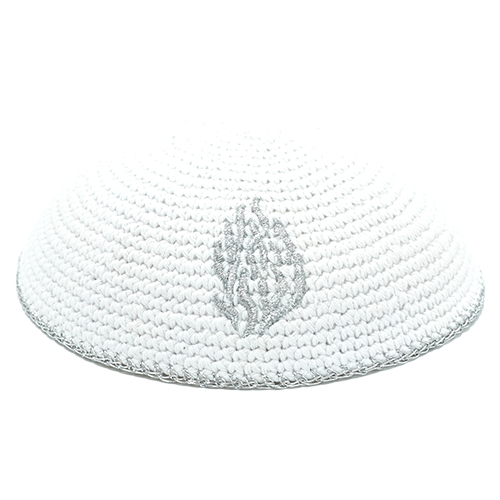 כיפה סרוגה 16 ס"מ לבנה עם ריקמה "האש שלי" כסף