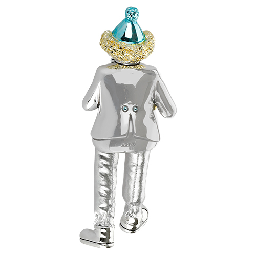 ליצן יושב מפוליריזן מוכסף עם רגלי בד כסף מנגן בתוף