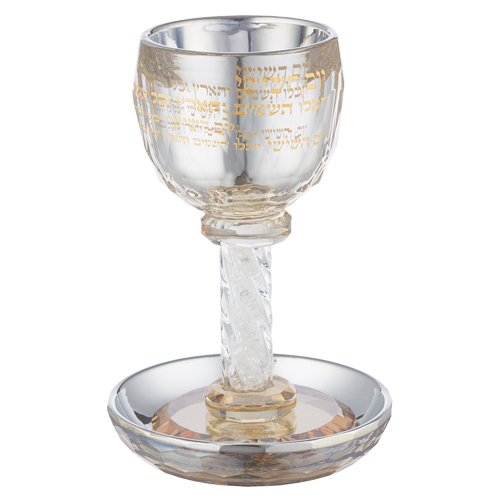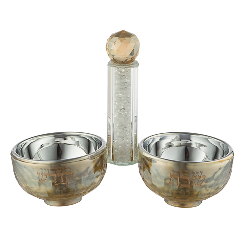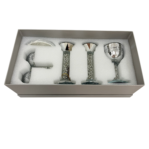 סט גביע קידוש + פמוטים + מלחייה מקריסטל עם אבני