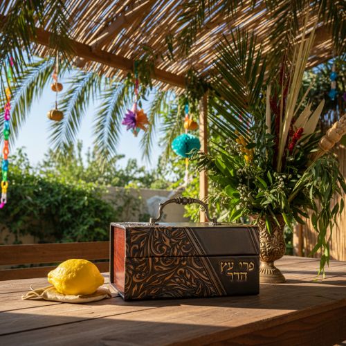 קופסא לאתרוג עץ ועור עם ידית מתכת דגם עלים 12X20X1