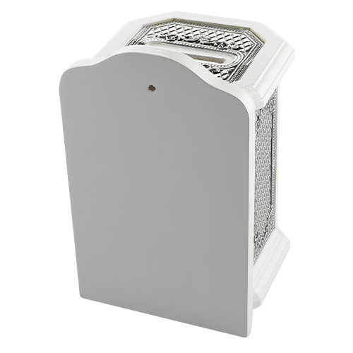 קופת צדקה עץ לבנה מהודרת עם פלקטה "עיטורים" 11×15 ס"מ